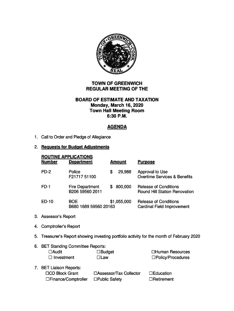 TOWN OF GREENWICH REGULAR MEETING OF THE BOARD OF ESTIMATE AND TAXATION Monday, March 16, 2020, Town Hall Meeting Room 6:30 P.M. AGENDA 1. Call to Order and Pledge of Allegiance 2. Requests for Budget