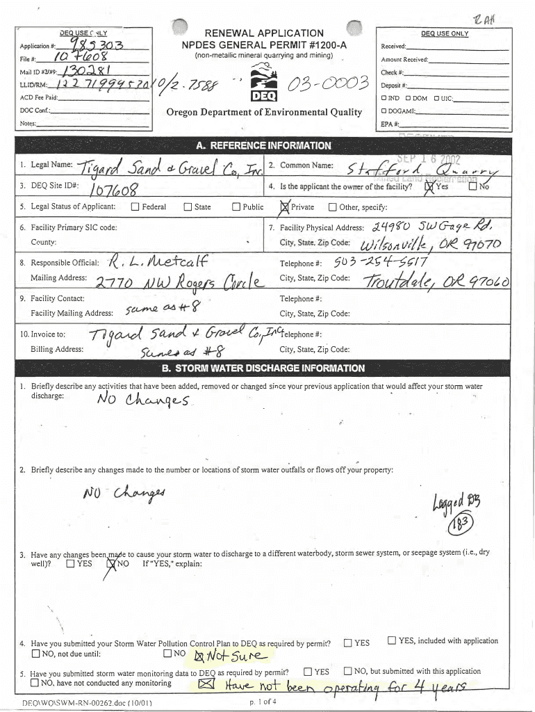 5.j 30.OE Application#:SE CLQ 0 rt Mail LD#2/#9: J,3oJ. J(' J 2 7/ GLIDER:RENEWAL APPLICATION NODES GENERAL PERMIT #1200A (nonmetallic mineral quarrying and mining)3File#:If7Cf t ?coach Fee Paid:.