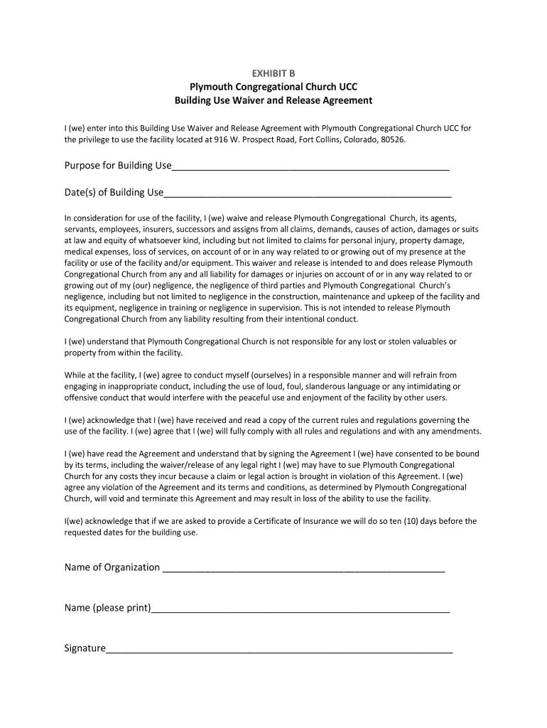 EXHIBIT B Plymouth Congregational Church UCC Building Use Waiver and Release Agreement I (we) enter into this Building Use Waiver and Release Agreement with Plymouth Congregational Church UCC for