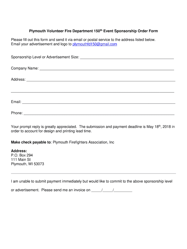 Get the free Plymouth Volunteer Fire Department 150th Event Sponsorship Order Form