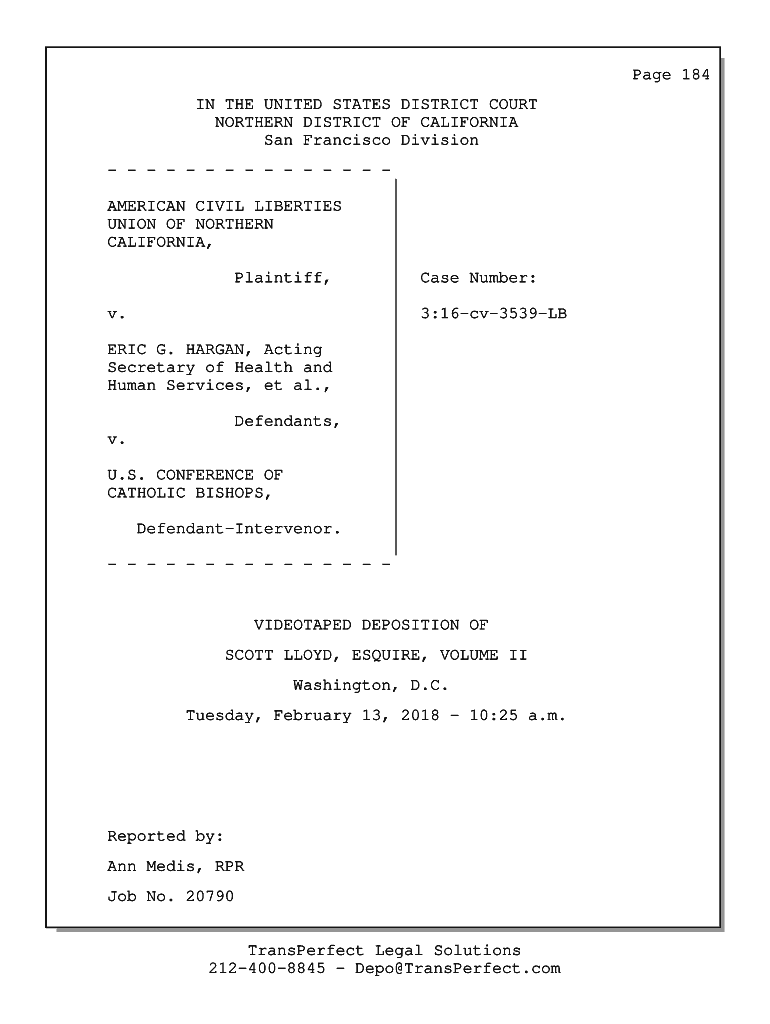 Page 184 IN THE UNITED STATES DISTRICT COURT NORTHERN DISTRICT OF CALIFORNIA San Francisco Division AMERICAN CIVIL LIBERTIES UNION OF NORTHERN CALIFORNIA, Plaintiff, v. ERIC G. HARLAN, Acting Secretary