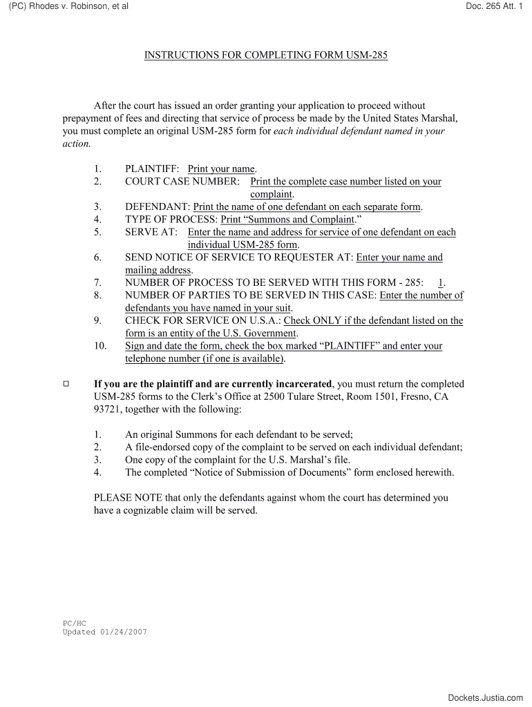 (PC) Rhodes v. Robinson, et Aldo. 265 ATT. 1INSTRUCTIONS FOR COMPLETING FORM USM285After the court has issued an order granting your application to proceed without