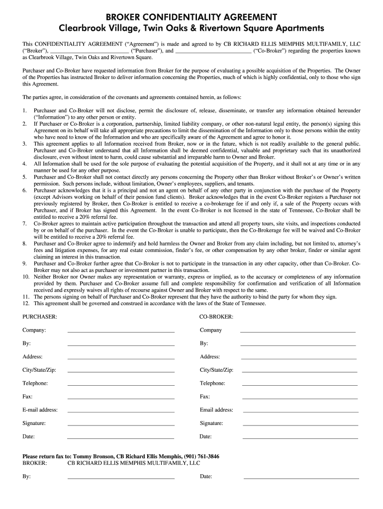 BROKER CONFIDENTIALITY AGREEMENT Clear brook Village, Twin Oaks & River town Square Apartments This CONFIDENTIALITY AGREEMENT (Agreement) is made and agreed to by CB RICHARD ELLIS MEMPHIS MULTIFAMILY,