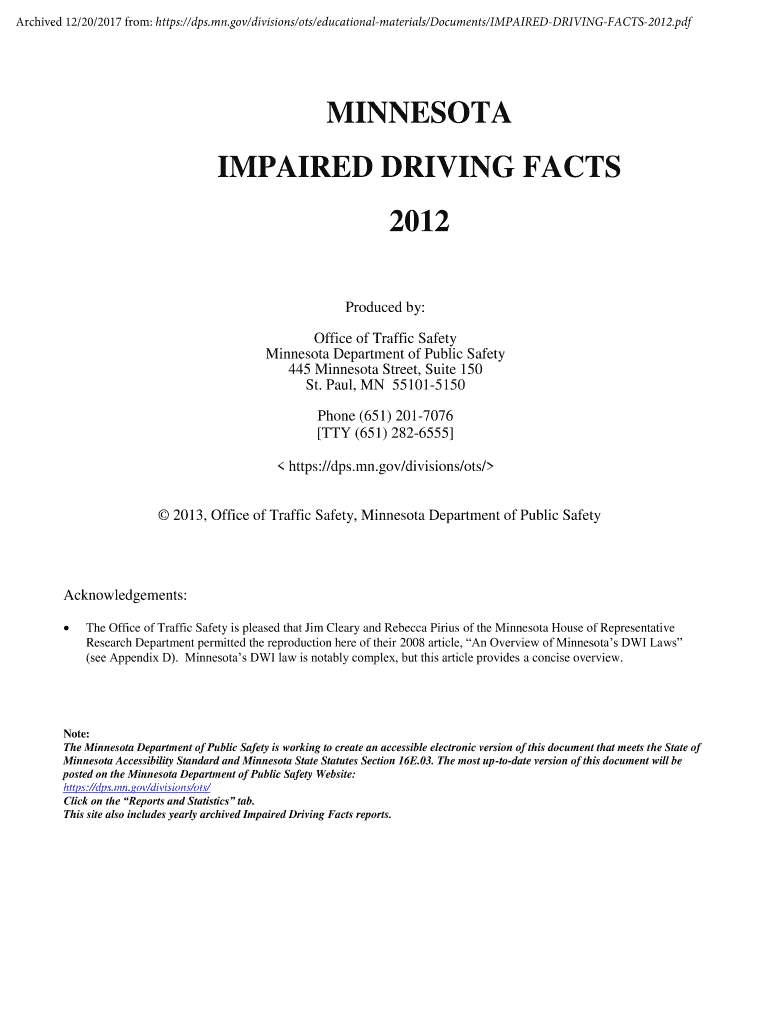 Archived 12/20/2017 from: https://dps.mn.gov/divisions/ots/educationalmaterials/Documents/IMPAIREDDRIVINGFACTS2012.pdfMINNESOTA IMPAIRED DRIVING FACTS 2012 Produced by: Office of Traffic Safety Minnesota