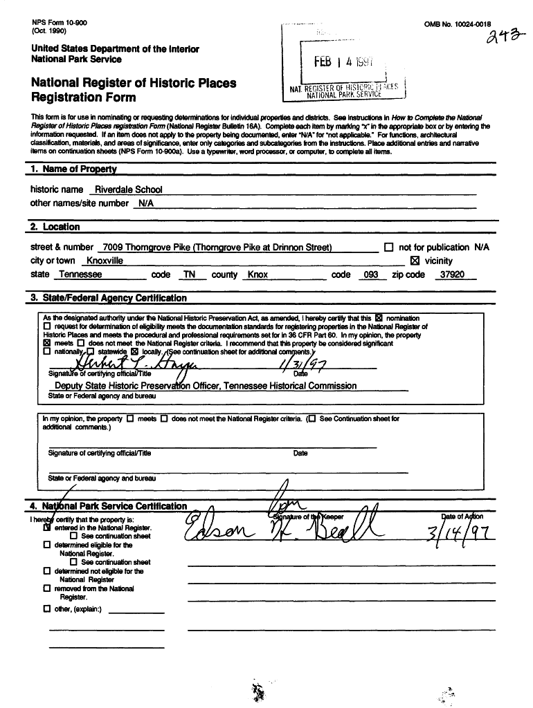 NFS Form 10900 (Oct. 1990)OMB No. 100240018United States Department of the Interior National Park ServiceNational Register of Historic Places Registration Form FB NAT REOIS1E. R OF This! C CFS NATIONAL