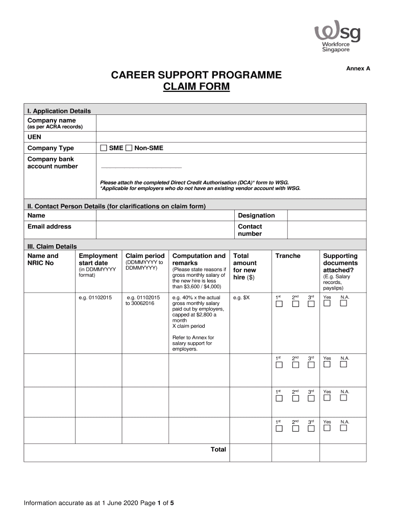 Annex CAREER SUPPORT Program CLAIM FORM I. Application Details Company name (as per ACRE records)MEN Company Type Company bank account numberSMENonSME Please attach the completed Direct Credit Authorization