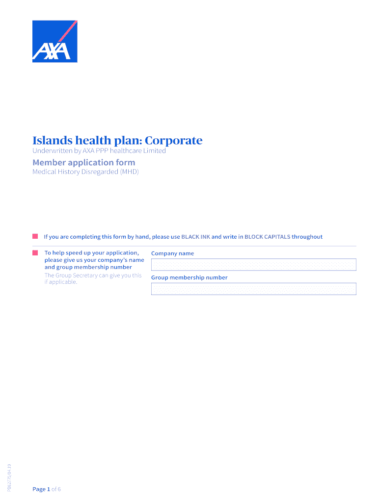Underwritten by AXA PPP healthcare LimitedMember application paramedical History Disregarded (MHD)If you are completing this form by hand, please use BLACK INK and write