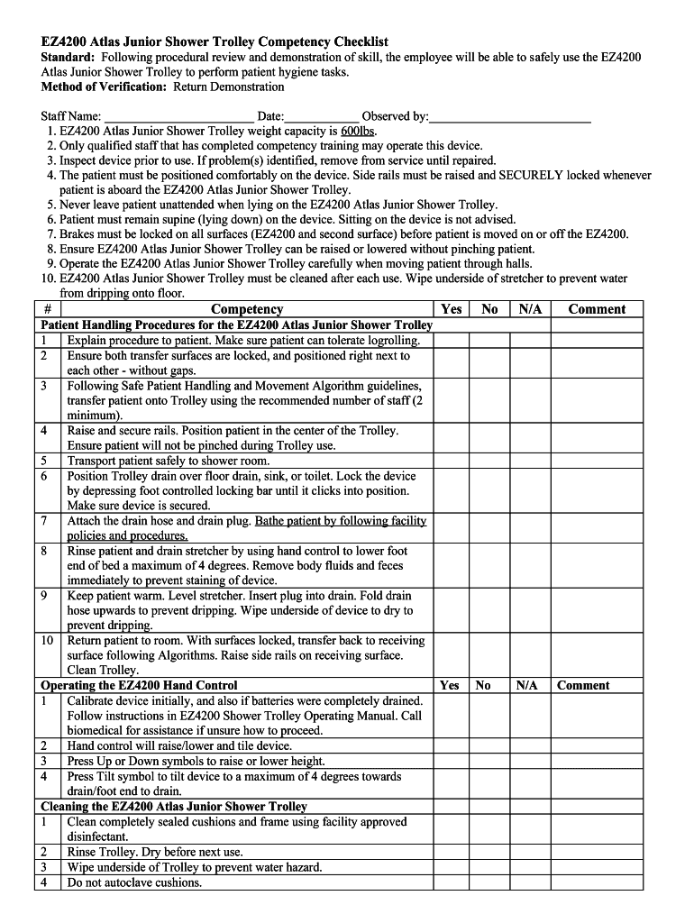 EZ4200 Atlas Junior Shower Trolley Competency Checklist Standard: Following procedural review and demonstration of skill, the employee will be able to safely use the EZ4200 Atlas Junior Shower Trolley