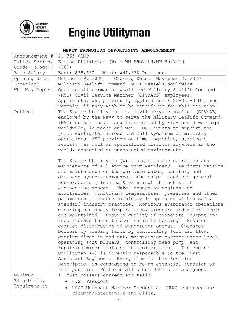 Announcement # Title, Series, Grade, (Code): Base Salary: Opening Date: Location: Who May Apply:Duties:Minimum Eligibility Requirements:MERIT PROMOTION OPPORTUNITY ANNOUNCEMENT 2136501MP Engine Utility
