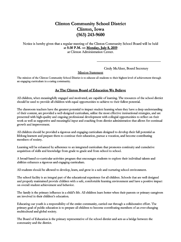Clinton Community School District Clinton, Iowa (563) 2439600 Notice is hereby given that a regular meeting of the Clinton Community School Board will be held at 5:30 P.M. on Monday, July 8, 2019,