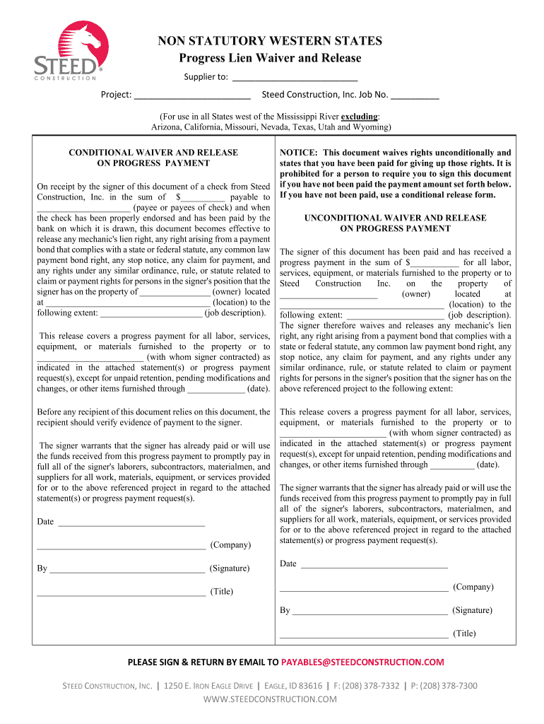 NON-STATUTORY WESTERN STATES Progress Lien Waiver and Release Supplier to: Project: Steed Construction, Inc. Job No. (For use in all States west of the Mississippi River excluding: Arizona, California,