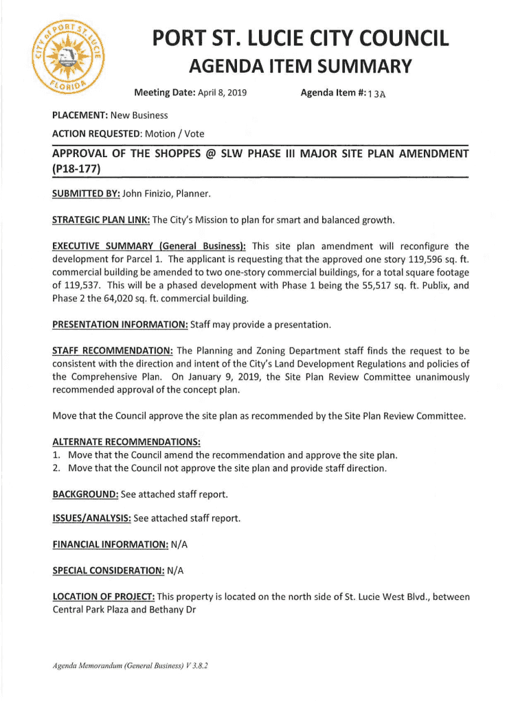 PORT ST. LUCIE CITY COUNCIL AGENDA ITEM SUMMARY Meeting Date: April 8, 2019Agenda Item #:1 3APLACEMENT: New Business ACTION REQUESTED: Motion / Preapproval OF THE SHOPPES SAW PHASE III MAJOR SITE