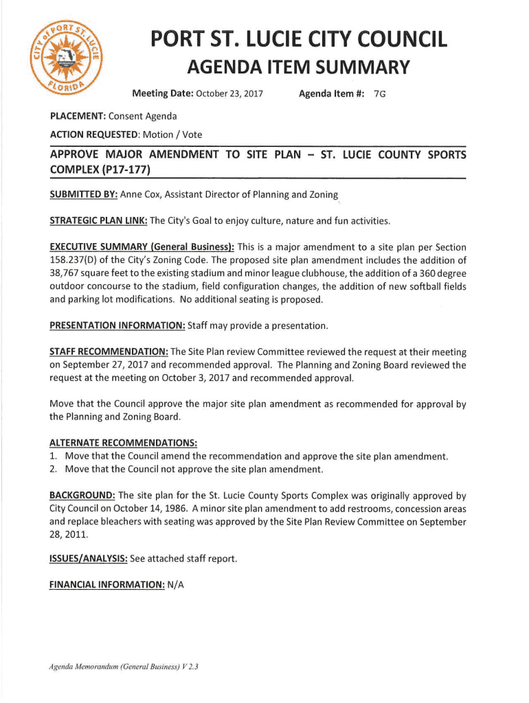 PORT ST. LUCIE CITY COUNCIL AGENDA ITEM SUMMARY Meeting Date: October 23, 2017Agenda Item #: 7GPLACEMENT: Consent Agenda ACTION REQUESTED: Motion / Preapprove MAJOR AMENDMENT TO SITE PLAN ST. LUCIE