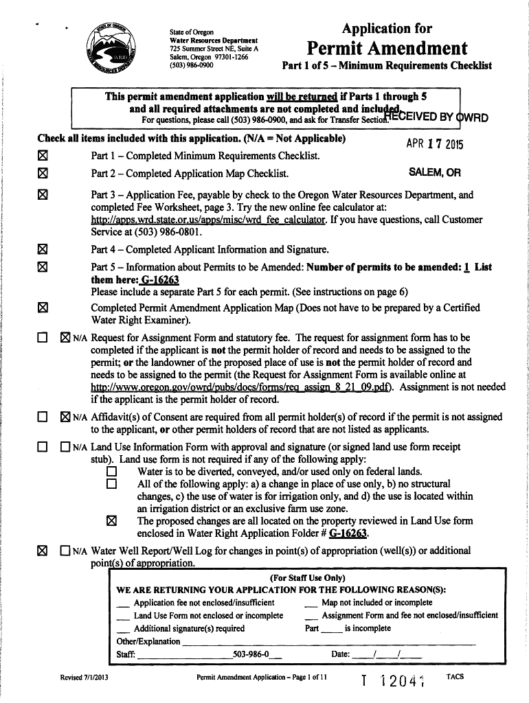 State of Oregon Water Resources Department 725 Summer Street NE, Suite A Salem, Oregon 973011266 (503) 9860900Application permit Amendment Part 1 of 5 Minimum Requirements Checklists permit amendment