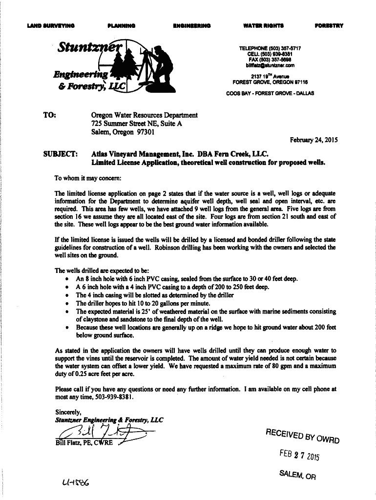 LAND IUllVIYINOPLAN NINOINOINllRINCIWATIR RICIHTIPORllTRYTELEPHONE (503) 3575717 CELL (503) 9398381 FAX (503) 3575698 blllflatz stuntzner.com 2137 19TH Avenue FOREST GROVE, OREGON 97116 COOS BAY FOREST