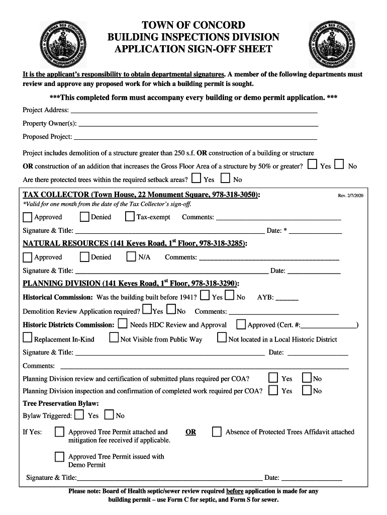 TOWN OF CONCORD BUILDING INSPECTIONS DIVISION APPLICATION SIGN-OFF SHEET It is the applicants' responsibility to obtain departmental signatures. A member of the following departments must review and