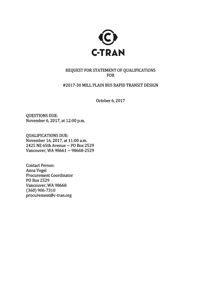 REQUEST FOR STATEMENT OF QUALIFICATIONS#201730 MILL PLAIN BUS RAPID TRANSIT DESIGNQUESTIONS DUE:November 6, 2017, at 12:00 p.m.QUALIFICATIONS DUE:November 16, 2017, at 11:00 a.m.2425 NE 65th Avenue