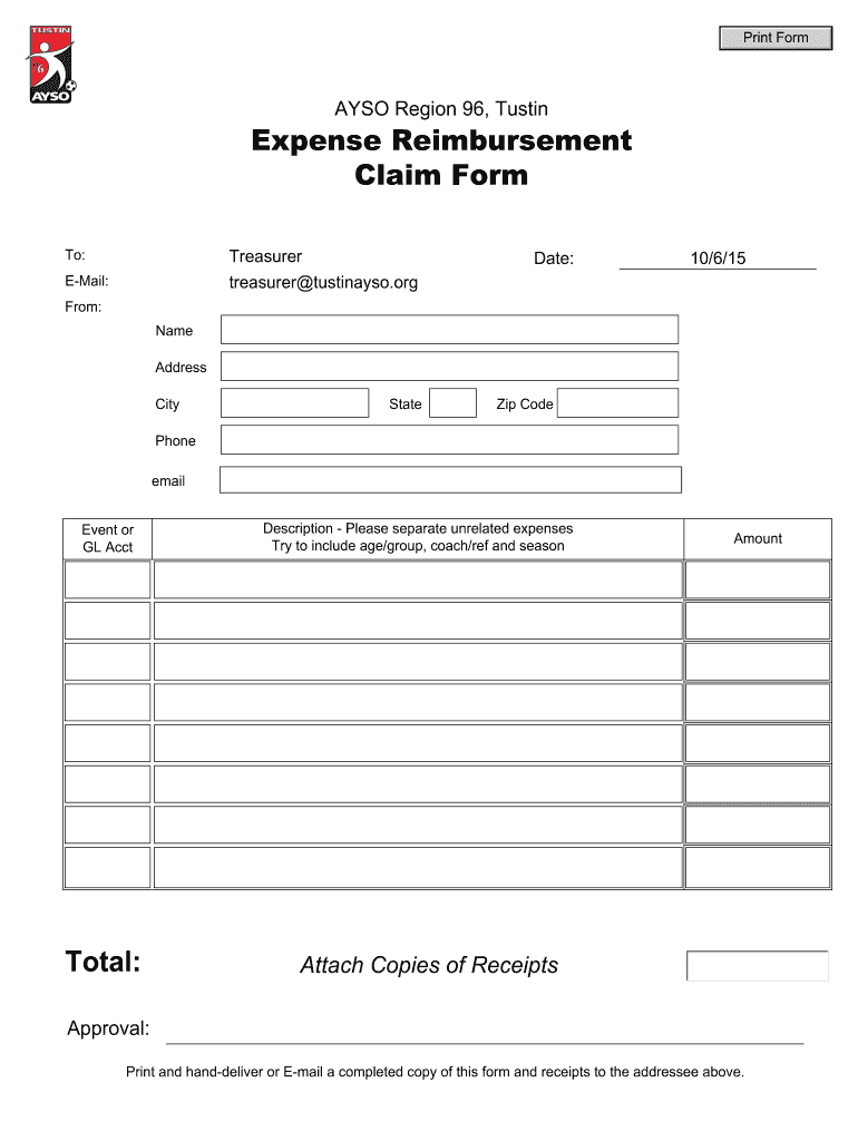 Print Formats Region 96, TustinExpense Reimbursement Claim Form Treasurer tustinayso.onto: Email:Date:10/6/15From: Name Address CityStateZip Telephone email Event or GL AcctTotal:Description Please