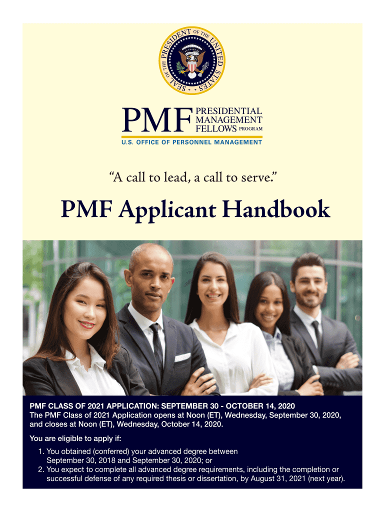 A call to lead, a call to serve.PMF Applicant Handbook PMF CLASS OF 2021 APPLICATION: SEPTEMBER 30 OCTOBER 14, 2020, The PMF Class of 2021 Application opens at Noon (ET), Wednesday, September 30,