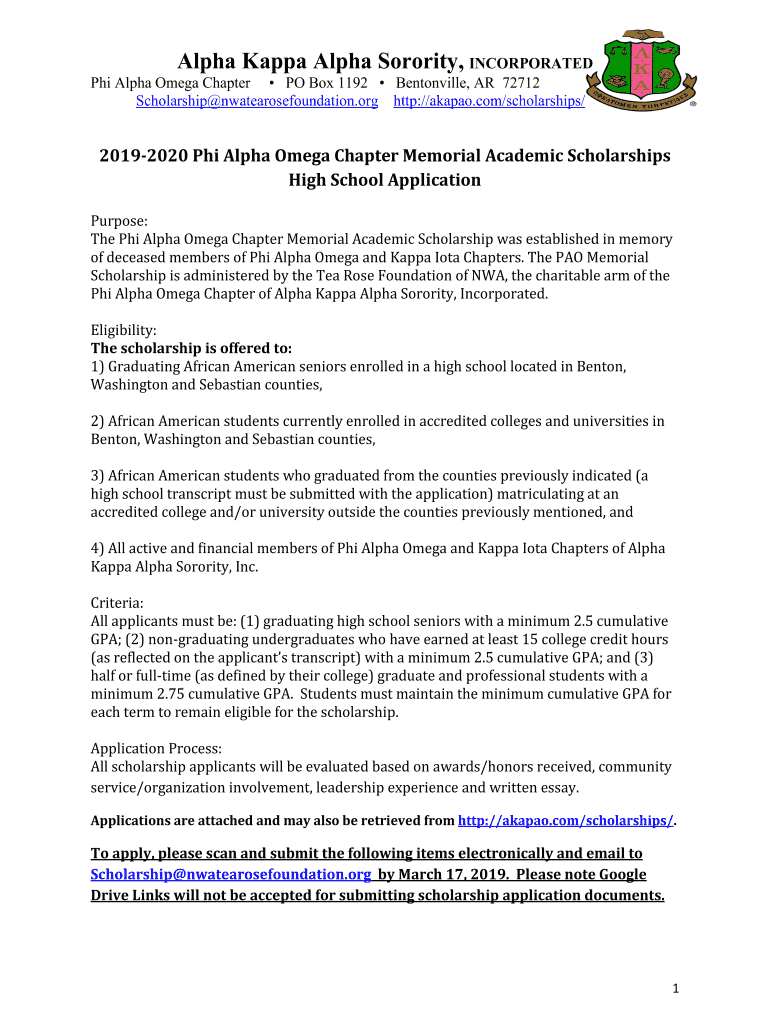 Alpha Kappa Alpha Sorority, INCORPORATED Phi Alpha Omega Chapter PO Box 1192 Bentonville, AR 72712 Scholarship nwatearosefoundation.org http://akapao.com/scholarships/ 20192020 Phi Alpha Omega Chapter
