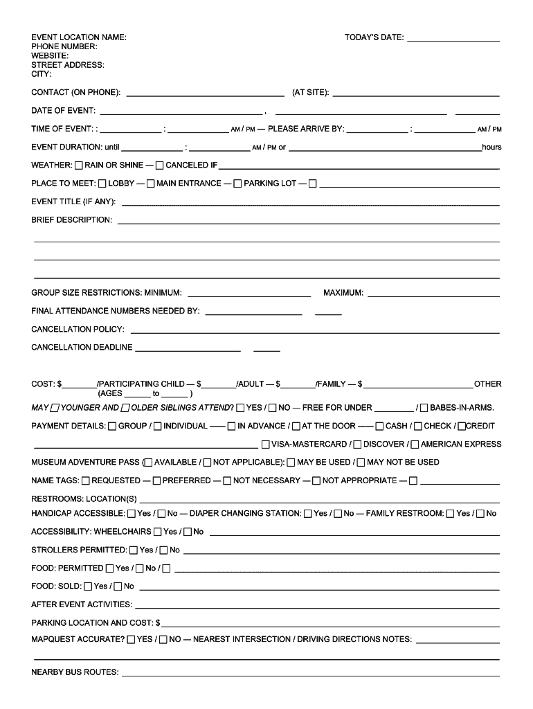 EVENT LOCATION NAME: PHONE NUMBER: WEBSITE: STREET ADDRESS: CITY:TODAYS DATE: CONTACT (ON PHONE): DATE OF EVENT:, (AT SITE): TIME OF EVENT: : : AM / PM PLEASE ARRIVE BY: : AM / PM EVENT DURATION:
