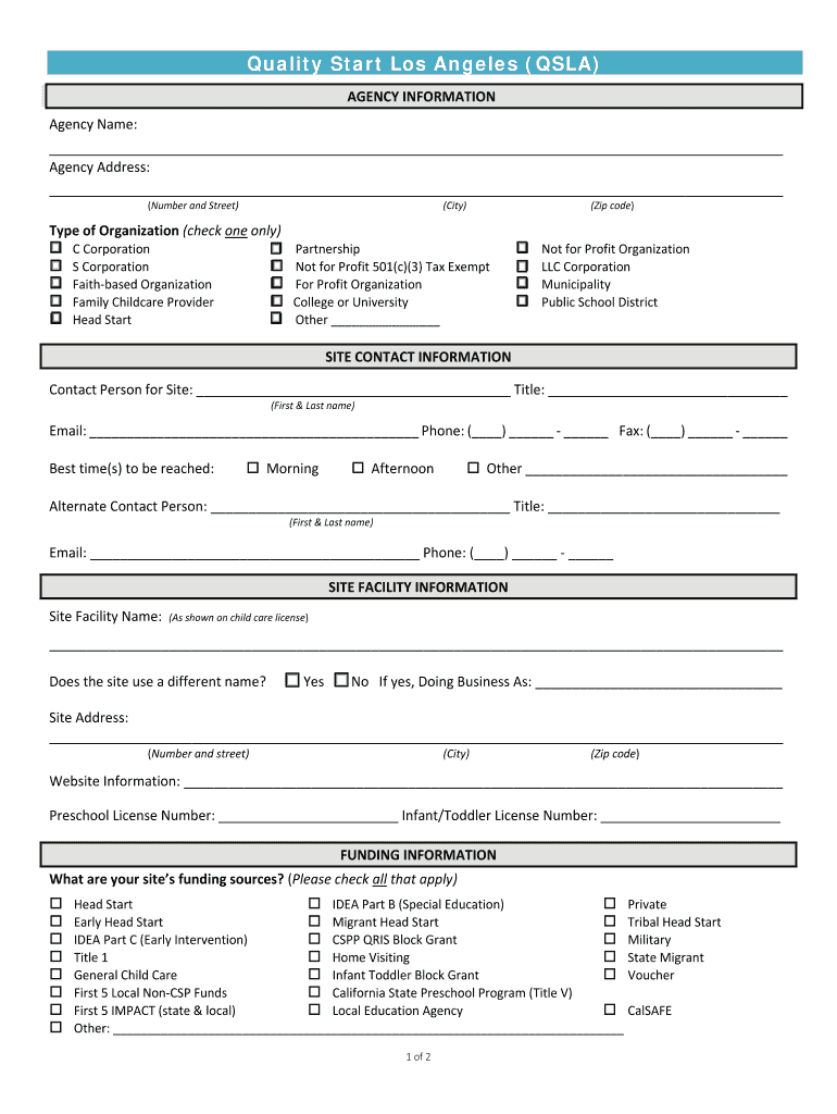 Quality Rating and Improvement System Enrollment Application This page is left blank intentionally Quality Start Los Angeles (SLA) AGENCYINFORMATION AgencyName: AgencyAddress: (NumberandStreet)(Zip