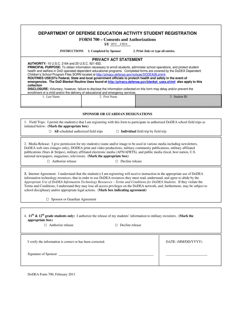 DEPARTMENT OF DEFENSE EDUCATION ACTIVITY STUDENT REGISTRATION FORM 700 Consents and Authorizations 2013 2014 SY / INSTRUCTIONS1. Completed by Sponsor2. Print (Ink) or type all entries. PRIVACY ACT
