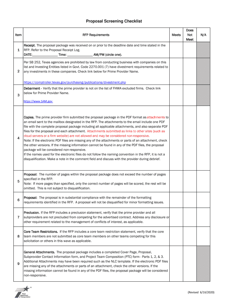 Proposal Screening Checklist Item12RFP RequirementsMeetsDoes Not Meet/Receipt. Receipt The proposal package was received on or prior to the deadline date and time stated in the RFP. Refer to the Proposal