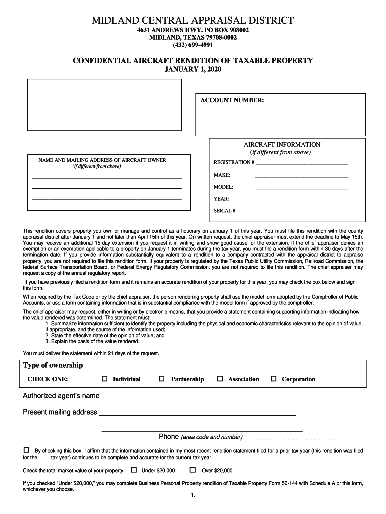 MIDLAND CENTRAL APPRAISAL DISTRICT 4631 ANDREWS HWY. PO BOX 908002 MIDLAND, TEXAS 797080002 (432) 6994991CONFIDENTIAL AIRCRAFT RENDITION OF TAXABLE PROPERTY JANUARY 1, 2020ACCOUNT NUMBER:AIRCRAFT