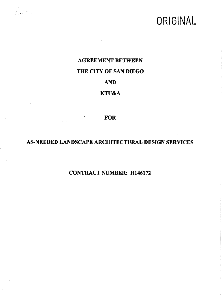 ORIGINALAGREEMENT BETWEEN THE CITY OF SAN DIEGO AND I(TU&AFORASNEEDED LANDSCAPE ARCHITECTURAL DESIGN SERVICESCONTRACT NUMBER: H146172AGREEMENT FOR DESIGN PROFESSIONAL SERVICES TABLE OF CONTENTS ARTICLE