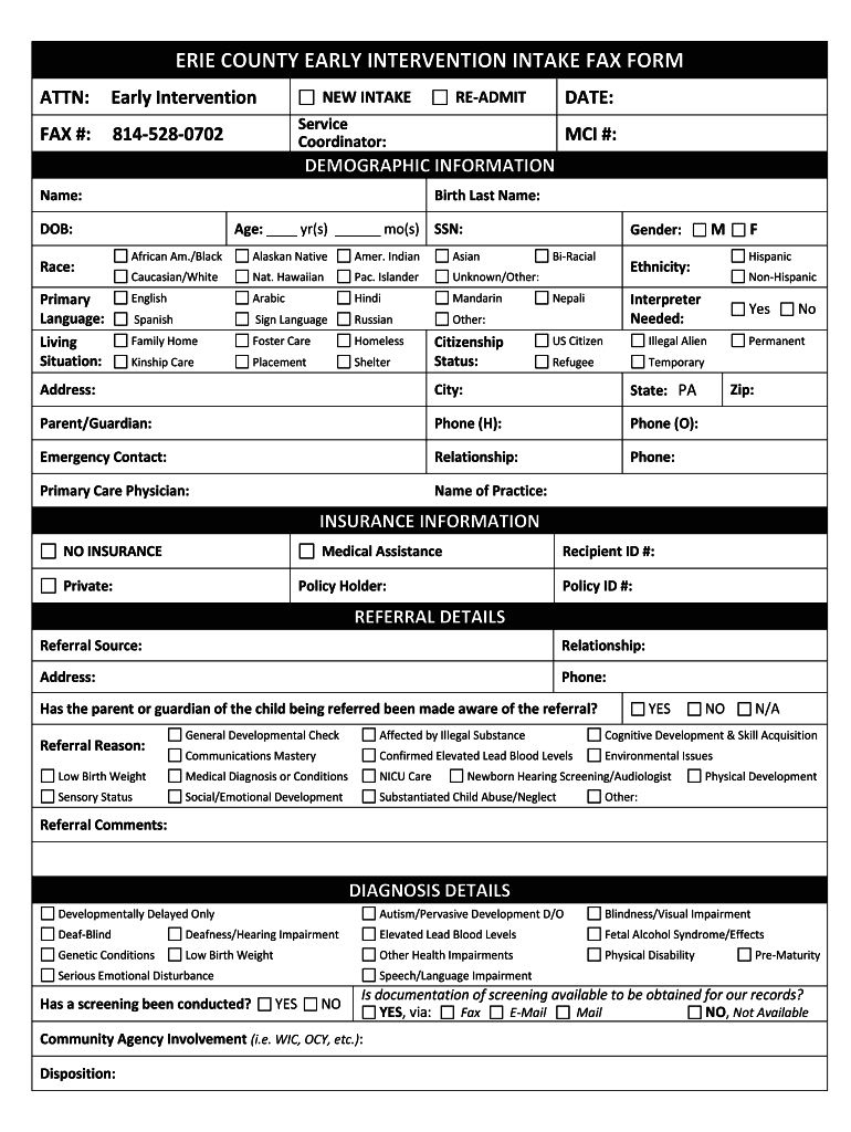 ERIE COUNTY EARLY INTERVENTION INTAKE FAX FORM ATTN:Early Intervention FAX #:8145280702NEW INTIMIDATE:READMITService Coordinator:MCI #:DEMOGRAPHIC INFORMATION Name:Birth Last Name:DOB: Race: Primary