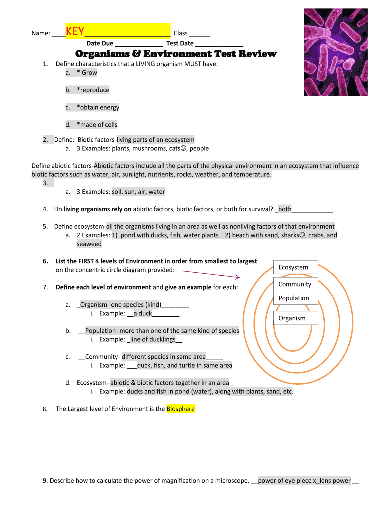 KEY Class Name: Date Due Test Date Organisms & Environment Test Review 1. Define characteristics that a LIVING organism MUST have: a. * Grow b. *reproduce c. *obtain energy d. *made of cells2. Define: