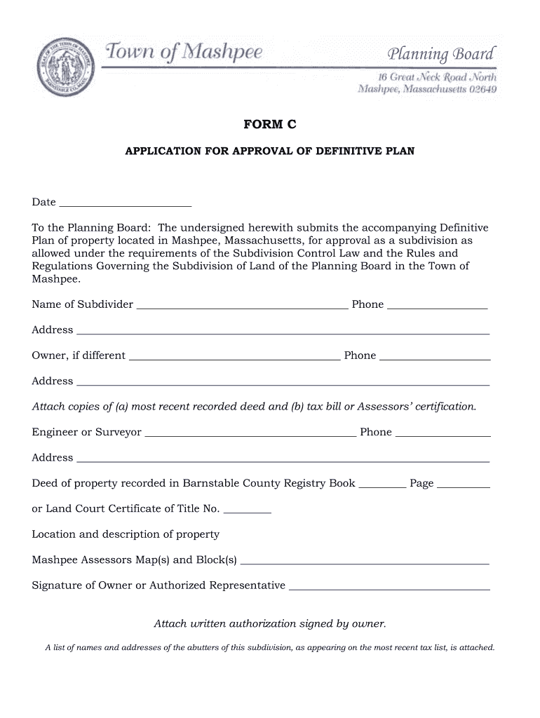Planning Boardroom C APPLICATION FOR APPROVAL OF DEFINITIVE Mandate To the Planning Board: The undersigned herewith submits the accompanying Definitive Plan of property located in Mash pee, Massachusetts,