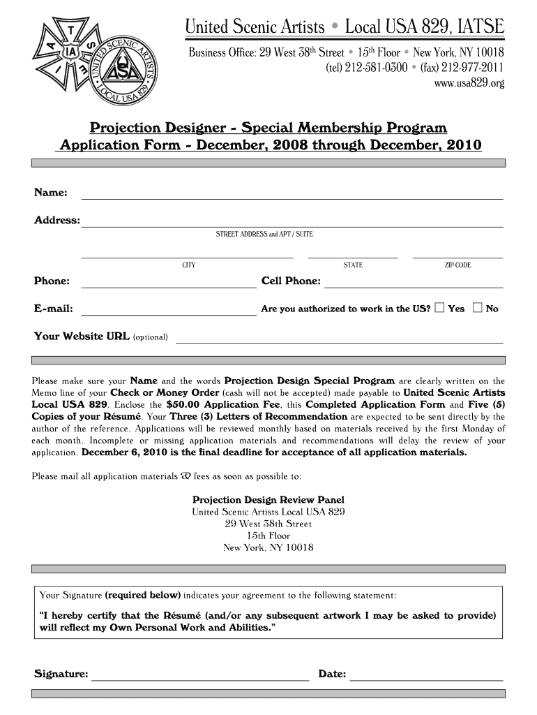 United Scenic Artists Local USA 829, IA TSE Business Office: 29 West 38th Street 15th Floor New York, NY 10018 (tel) 212-581-0300 (fax) 212-977-2011 www.usa829.org Print This Form Projection Designer