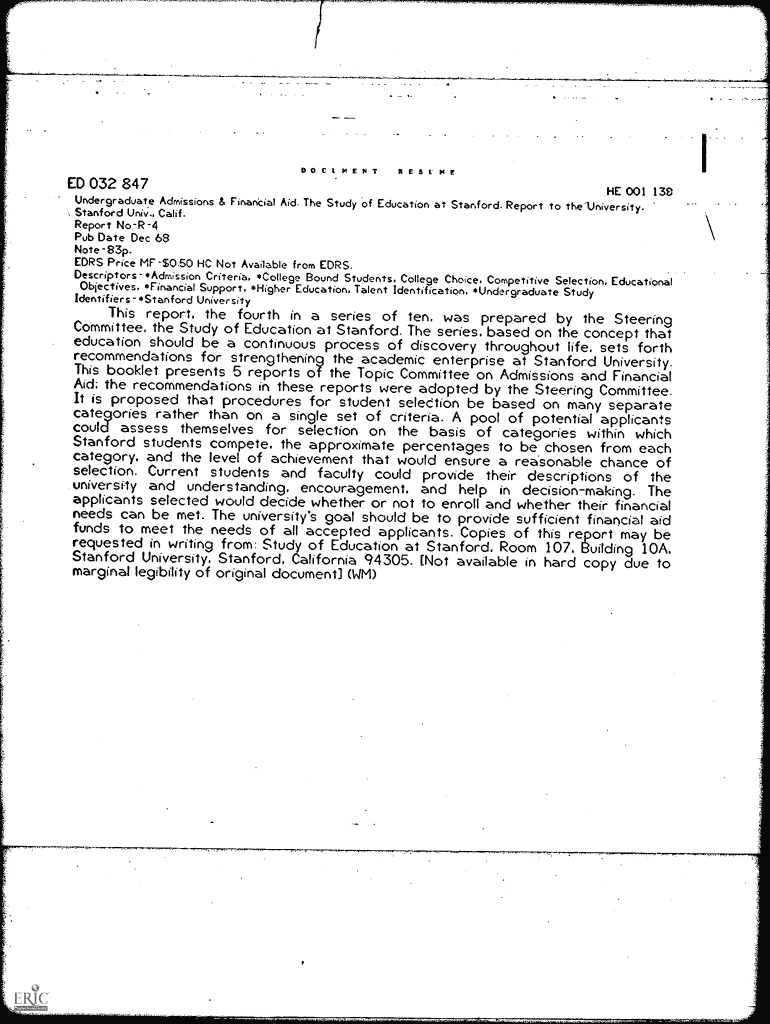 HE 001 138Undergraduate Admissions E. Financial Aid. The Study of Education at Stanford. Report to the\'University.