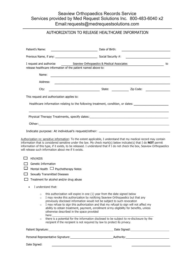 Sea view Orthopedics Records Service Services provided by Med Request Solutions Inc. 8004836040 x2 Email:requests medrequestsolutions.com AUTHORIZATION TO RELEASE HEALTHCARE INFORMATIONPatients Name:Date