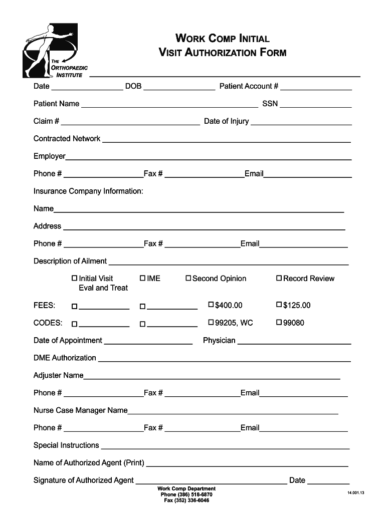 Work Comp Initial Visit Authorization Form Date DOB Patient Account # Patient Name SSN Claim # Date of Injury Contracted Network Employer Phone # Fax # Email Insurance Company Information: Name Address