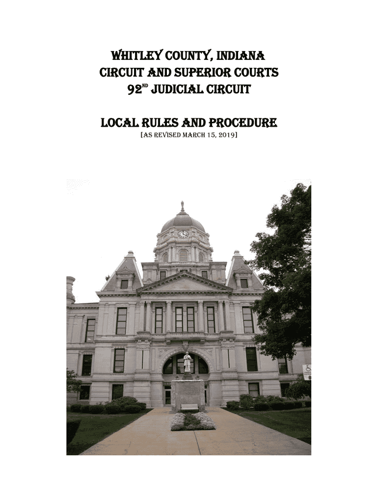 WHITLEY COUNTY, INDIANA CIRCUIT AND SUPERIOR COURTS 92ND JUDICIAL CIRCUIT LOCAL RULES AND PROCEDURE As revised March 15, 2019, LOCAL COURT RULES FOR WHITLEY CIRCUIT COURT AND WHITLEY SUPERIOR COURT