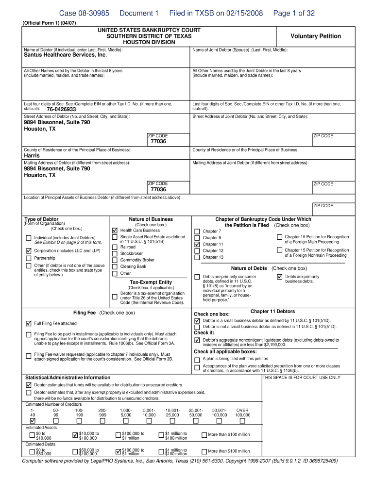 Case 0830985Document 1Filed in TSB on 02/15/2008Page 1 of 32(Official Form 1) (04/07)UNITED STATES BANKRUPTCY COURT