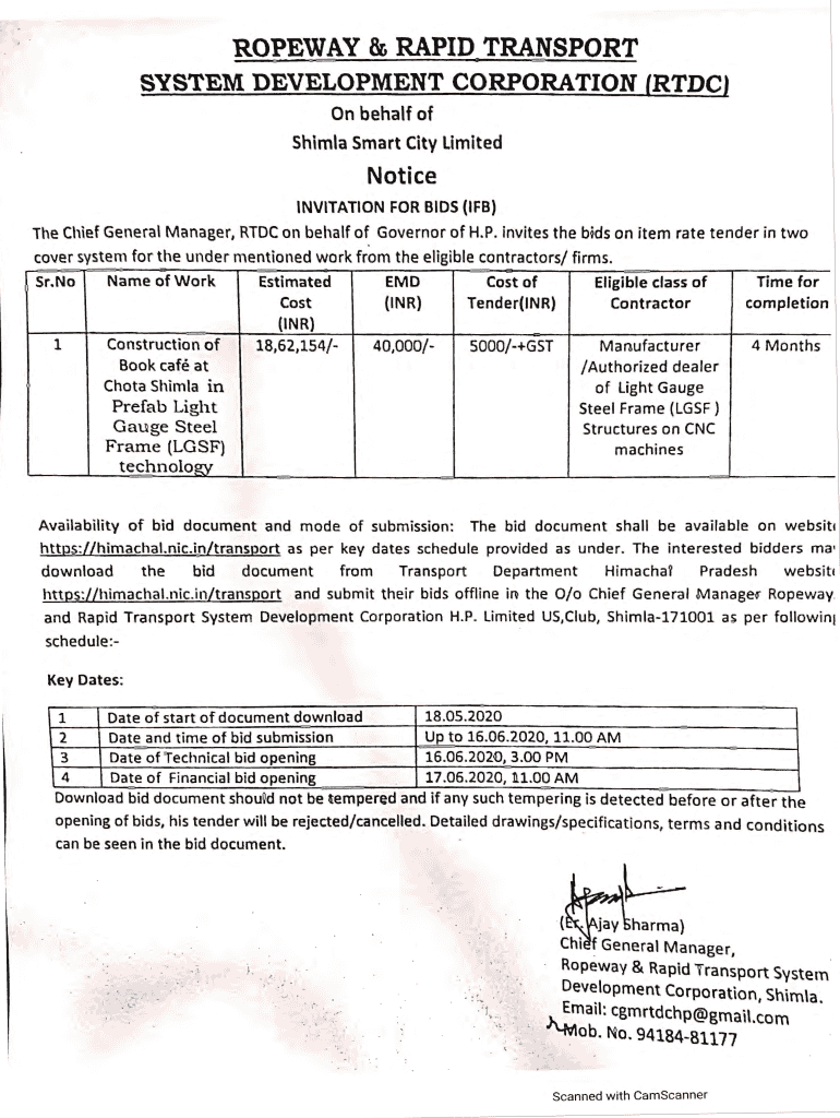 ROADWAY & RAPID TRANSPORT SYSTEM DEVELOPMENT CORPORATION (RDC) On behalf of Shim la Smart City limitedNotice INVITATION FOR BIDS (IF) The Chief General Manager, RDC on behalf of Governor of H.P. invites