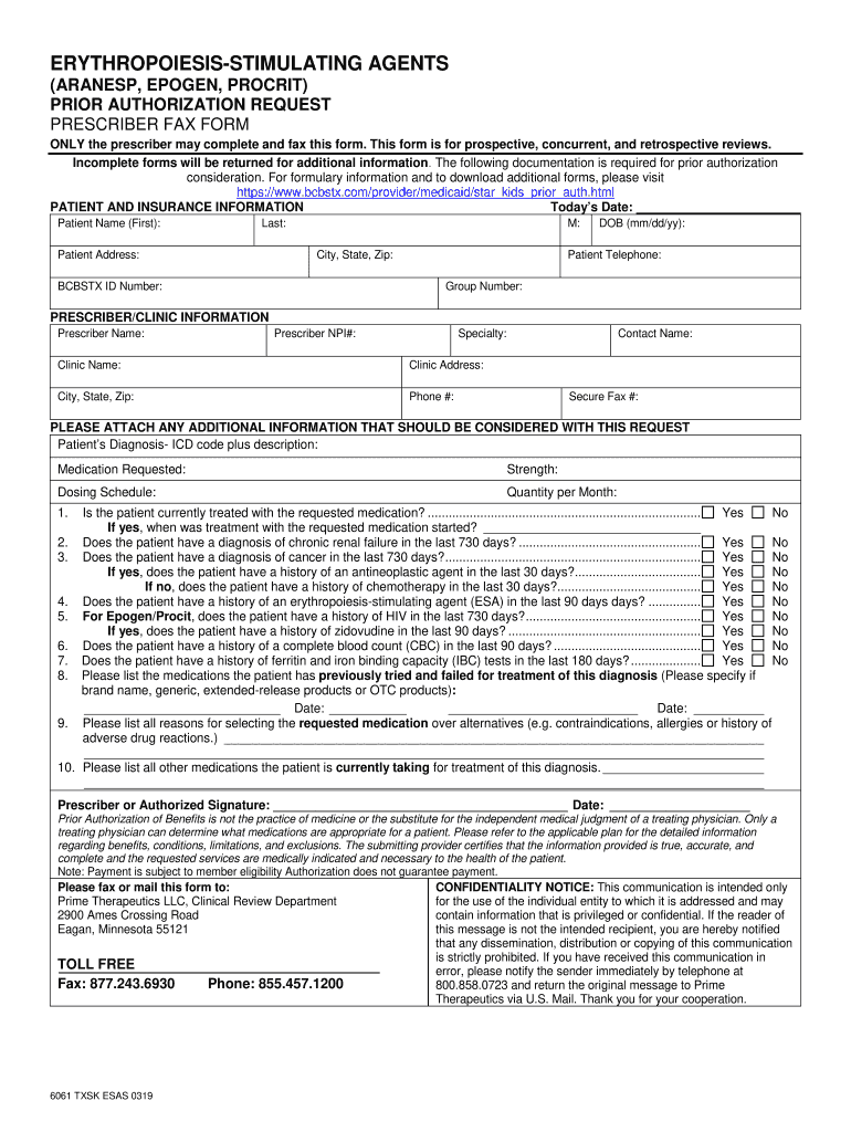 ERYTHROPOIESISSTIMULATING AGENTS (,) PRIOR AUTHORIZATION REQUEST PRESCRIBER FAX FORM ONLY the prescriber may complete and fax this form. This form is for prospective, concurrent, and retrospective