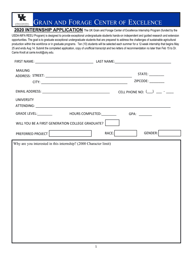 2020 INTERNSHIP APPLICATION The UK Grain and Forage Center of Excellence Internship Program (funded by the
