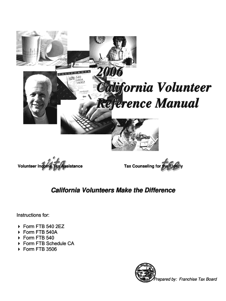 2006 California Volunteer Reference ManualVolunteer Income Tax Assistance Counseling for the Elderly California Volunteers Make the DifferenceInstructions for: Form FT 540 2EZ Form FT 540A Form FT
