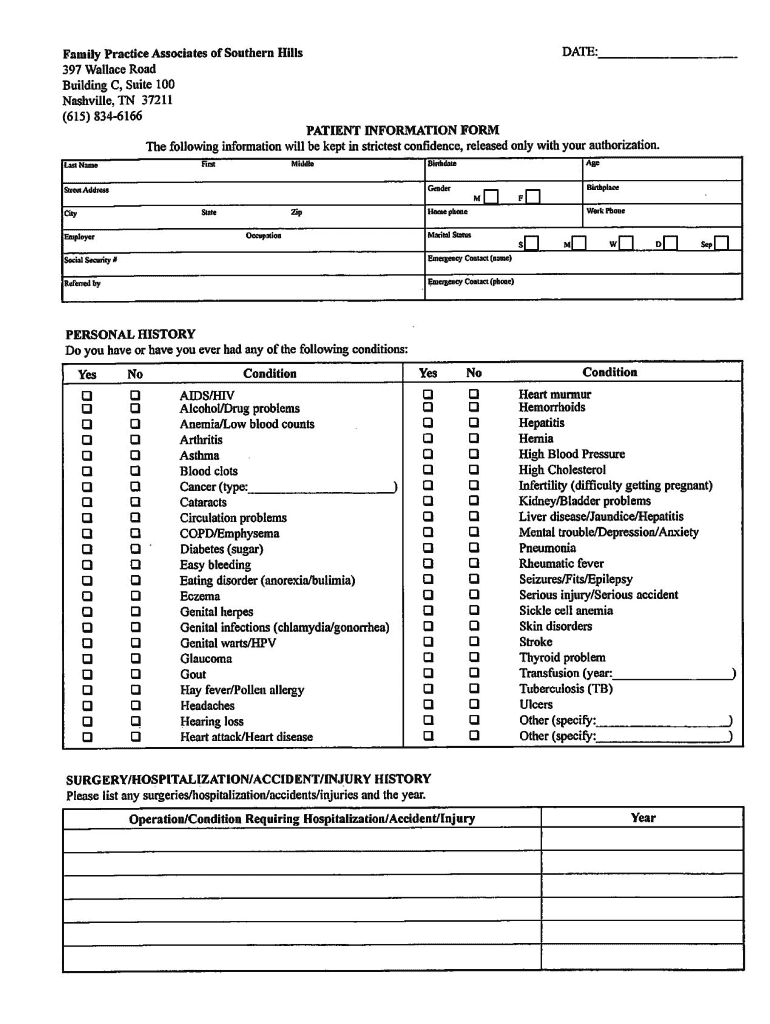 Family Practice Associates of Southern Hills 397 Wallace Road Building C, Suite 100 Nashville, TN 37211 (615) 8346166DATE: PATIENT INFORMATION FORM The following information will be kept in the strictest