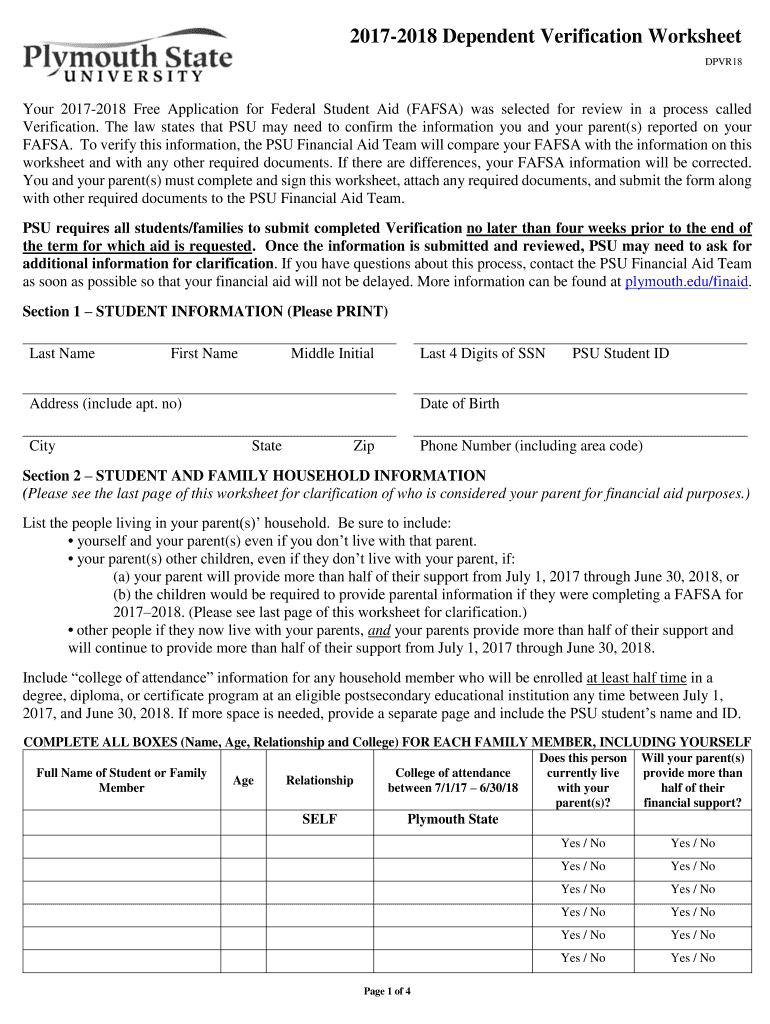 Students selected for verification by the financial aid office of their school must complete the 2017-2018 verification worksheet dependent to validate their FAFSA information.