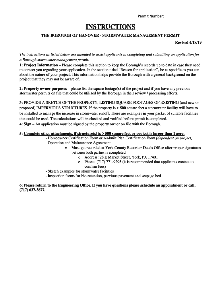 Permit Number: INSTRUCTIONS THE BOROUGH OF HANOVER STORMWATER MANAGEMENT PERMIT Revised 4/18/19 The instructions as listed below are intended to assist applicants in completing and submitting an application