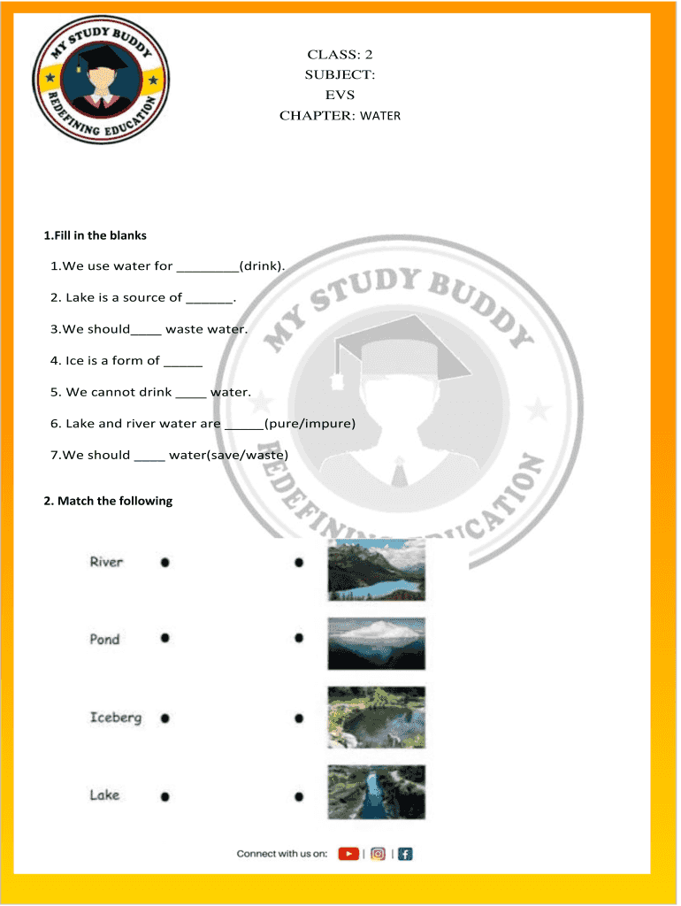 CLASS: 2 SUBJECT: EVS CHAPTER: WATER1. Fill in the blanks 1. We use water for (drink). 2. Lake is a source of. 3. We should waste water. 4. Ice is a form of 5. We cannot drink water. 6. Lake and river