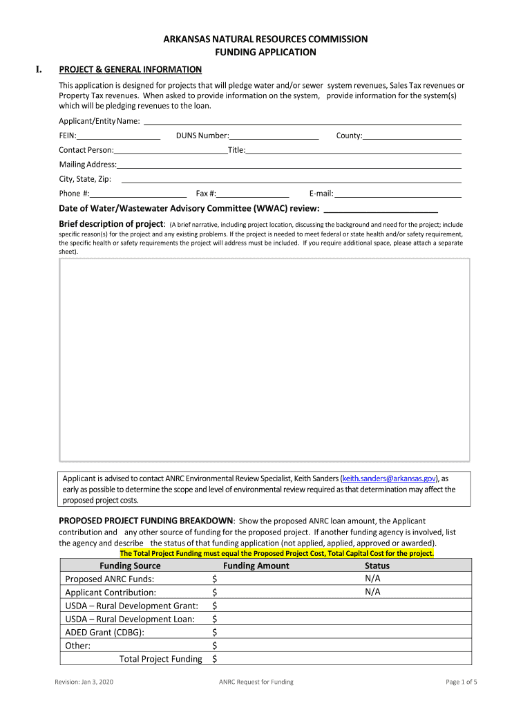ARKANSAS NATURAL RESOURCES COMMISSION FUNDING APPLICATION I.PROJECT & GENERAL INFORMATION This application is designed for projects that will pledge water and/or sewer system revenues, Sales Tax revenues