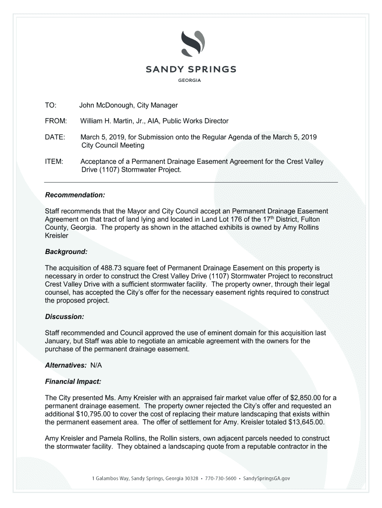 TO:John McDonough, City ManagerFROM:William H. Martin, Jr., AIR, Public Works Directorate:March 5, 2019, for Submission onto the Regular Agenda of the March 5, 2019,