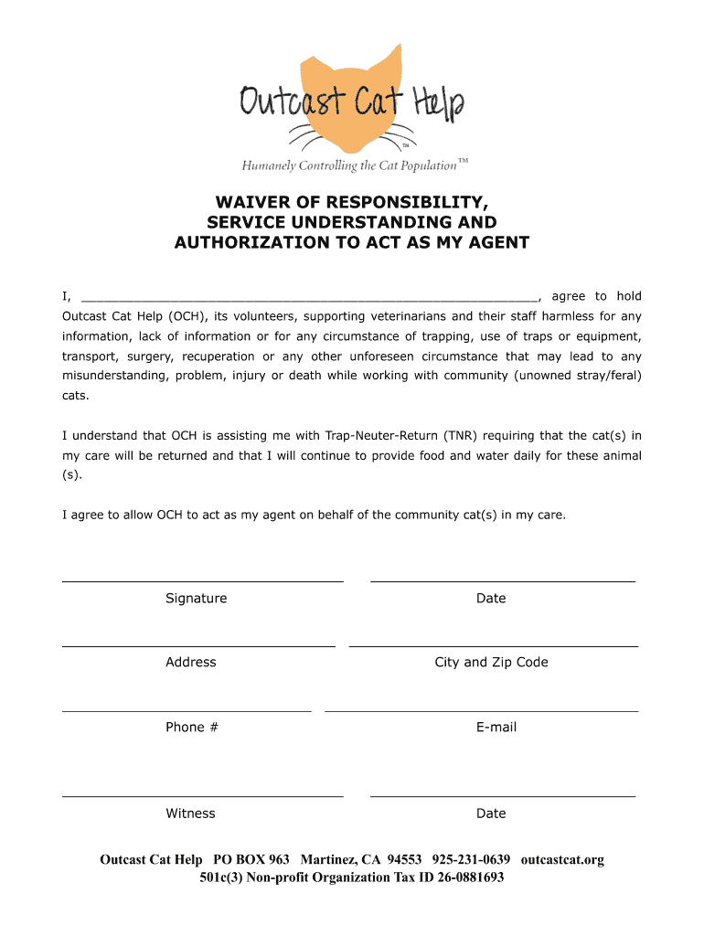 WAIVER OF RESPONSIBILITY, SERVICE UNDERSTANDING AND AUTHORIZATION TO ACT AS MY AGENT I, agree to hold Outcast Cat Help (OCH), its volunteers, supporting veterinarians and their staff harmless for